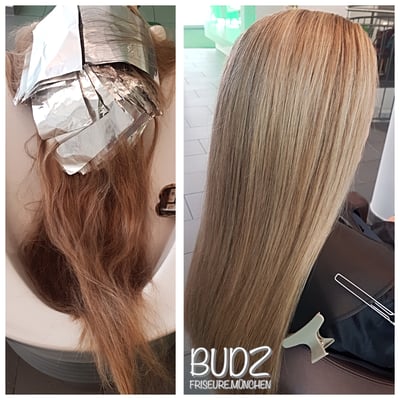 Wunderschöne blond gefärbte und trotzdem gesunde Haare sind nicht nur teuerer bei der Färbung, weil schonender und mit mehr Zeit gearbeitet wird, sie bedürfen auch spezieller individuell abgestimmter Pflegeprodukte für zuhause um das Blond zu erhalten und die Haarstruktur aufzubauen.